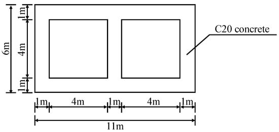 A large culvert intersection project with a backwater canal is used as the background. The type is an assembly culvert, and the main design index is as follows: the design length is 234 m, design flow rate is 53.9 m3/s, the design water depth is 3.5 m, the structure of the pipe body is box-type, the section size is 2 × 4.0 m × 4.0 m, the length of gate section is 10 m, and the length of building arrangement is 154 m. The culvert axis intersects with the backwater canal at an angle of roughly 77°, which is convenient for traffic. The design dimensions of the culvert are shown in Figure 2.