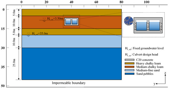 Displacement boundary condition setting: The surface and channel surface are free. The four sides of the model are only allowed to move in-plane, and their normal displacement constraint is 0. The bottom of the model uses fixed constraints to limit the displacement to 0. Seepage boundary condition setting: It is considered that there is sufficient water recharge, and groundwater is always kept 20 m below the surface. The pore water pressure in the horizontal plane 20 m below the surface is always set to 0. The hydrostatic pore pressure boundary is on the side of the model. In the ground stress equilibrium stage, the surface leakage area of the inner wall of the culvert adopts the ABAQUS default state impermeable boundary. The water pressure and pore pressure of the inner wall of the culvert are set at 3.5 m. The setting of the interaction between the culvert and soil: The contact surface between the outer surface of the culvert and the soil is restrained by a tie, and the rotational freedom of the slave surface is limited to be the same as that of the main surface. In this simulation, except for the medium-fine sand and sandy pebbles, which adopt the linear elastic principal structure, all the soils are simulated by the elastic–plastic principal structure relationship based on the Mohr–Coulomb yield criterion, and the C20 concrete adopts the linear elastic principal structure.