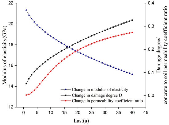 From the derivation of Equations (3) and (4), the model equation for the evolution of concrete dissolution damage degree D with time is obtained in Equation (5), and the model equation for the evolution of concrete elastic modulus with time is obtained in Equation (6):