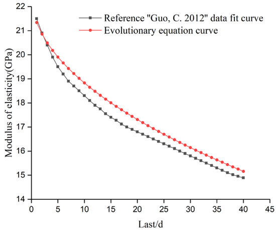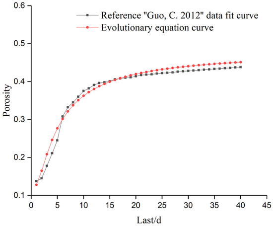 In order to verify the rationality of the constructed evolutionary model, the evolutionary model curves were compared with the fitted curves of the concrete dissolution degradation test performed at Zhejiang University [34]. The fitted curve in reference [34] for porosity is plotted against the evolution equation curve, as shown in Figure 7, and the fitted curve in reference [34] for the elastic modulus is plotted against the evolution equation curve, as shown in Figure 8.
