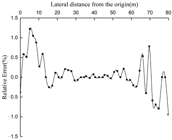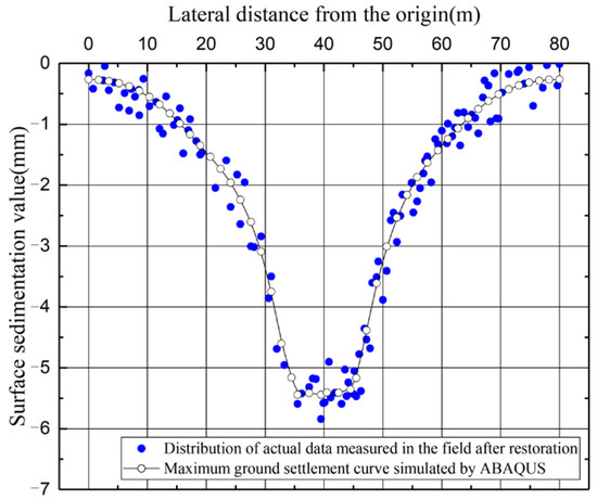 In order to verify the reasonableness of the numerical model, it is proposed to compare the simulated maximum surface settlement results with the actual field measurement results. Since the field test area is not completely consistent with the simulated area, there are a few missing data, and here the results and laws of the field test of underground culverts by Chen et al. [35] are used to complete the measured data in the hydrogeological report of the project. The reasonableness of the numerical model is reflected qualitatively by comparing the consistency of the maximum surface settlement curve calculated by the model with the variation pattern of the measured surface settlement values. As seen in Figure 9 and Figure 10, the maximum settlement curve of the ground surface obtained from the ABAQUS-based simulation is essentially consistent with the measured vertical displacement variation law of the ground surface, with a maximum relative error of 1.22%, and the simulation calculation results are more consistent. Therefore, the constructed numerical model of concrete dissolution degradation can reasonably reflect the changes in the displacement field.