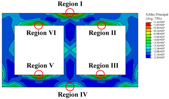 The occurrence of dissolution damage in different parts of concrete will lead to changes in the internal forces of the concrete structure, which adversely affect the long-term operation of the project. Since the tensile strength of concrete is much lower than the compressive strength, the main tensile stress interval of concrete is studied. From the initial state of the maximum stress, shown in the Figure 11, separate zones can be seen in six parts of the obvious tensile stress concentration. The six zones are named as the I~VI regions, and both the sides and the central part of the obvious tensile stress area are not seen at this analysis site.