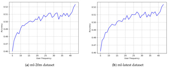 In Equation (7), F represents the frequency of the user, and k represents the frequency category of the user. Therefore, the value range of the abscissa user frequency is , and each value represents a numerical interval of user frequency. Based on the original datasets, all interaction data in this interval are screened out. All interactions of the same user are randomly divided into a training set and test set, and the obtained accuracy on the test set is taken as the numerical result of the ordinate.