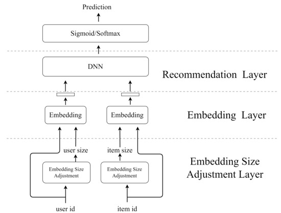 The embedding size adjustment layer saves the current embedding size and user–item frequency. When receiving a user or item, this layer converts the occurrence frequency of the user or item and the current embedding dimension into the embedding vector and one-hot encoding, respectively. Then, the layer concatenates them and feeds them into the multi-layer perceptron. Through the softmax activation function, the adjustment strategy, i.e., whether the embedding vector is expanded or maintained, is confirmed. Finally, the layer sets the dimension size of the embedding vector as the output. The process is described in detail below.