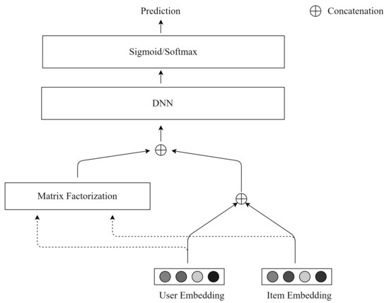 - He, X.; Liao, L.; Zhang, H.; Nie, L.; Hu, X.; Chua, T.S. Neural collaborative filtering. In Proceedings of the 26th International Conference on World Wide Web, Perth, Australia, 3–7 April 2017; pp. 173–182. [Google Scholar]