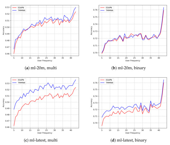 It is evident that, compared to the MovieLen 20M dataset, on which matrix factorization has slight positive influences, the MovieLens Latest dataset has been significantly improved in all tasks. Since the former dataset mainly consists of medium- and high-frequency data and the latter consists of more low-frequency data, the matrix factorization method has a more obvious impact on improving the prediction accuracy of low-frequency data. Moreover, the effect of TMMNN is much better than ESAPN, and we can notice that the blue curves in Figure 5c,d are much higher than the red curves in the low frequency data area, which indicates that the addition of matrix factorization can actually help the model to capture the linear interactions and improve the prediction accuracy of low-frequency users. Hence, the result proves the effectiveness of the method.