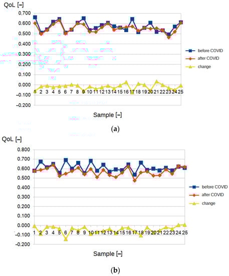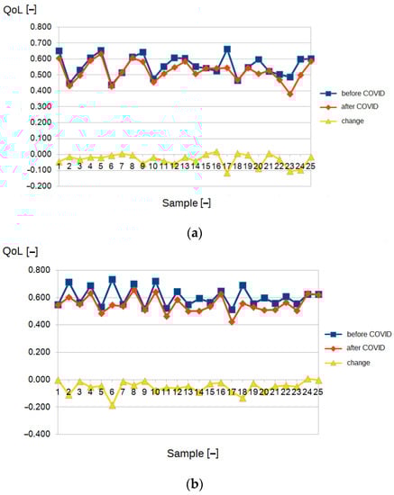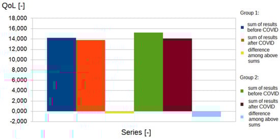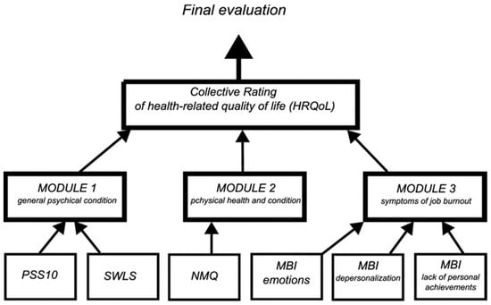 If there is no reason to emphasize any area of life, in the reliable quality evaluation model, we treat all partial assessments as equally important. In the study, the Perceived Stress Score (PSS10), Maslach Burnout Inventory (MBI), and Nordic Musculoskeletal Questionnaire (NMQ) were used. PSS10 measures psychological stress—it is used to assess the extent to which situations in a person’s life are judged by them to be stressful []. MBI is a tool to measure professional burnout in three dimensions: emotional exhaustion (EE), depersonalization (DP), and personal achievement (PA) []. The Satisfaction with Life Scale (SWLS) is a short 5-item instrument designed to measure global cognitive judgments of satisfaction with one’s life. The NMQ is a symptom questionnaire for musculoskeletal disorders, mainly for lower back, neck, and shoulder pain []. All of the above-mentioned tests are frequently used, valid, and reliable [,,] and thus comparative material is more readily available, but they are rarely used simultaneously, which adds value to the present study.
