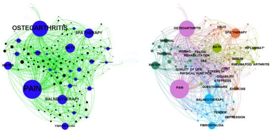 A literature search on PubMed using the following string: “(((balneotherapy [MeSH Terms]) OR (peloid therapy [MeSH Terms])) OR (spa therapy [MeSH Terms])) AND (rheumatic disease [MeSH Terms])” was performed. MeSH terms were used to increase the effectiveness of the search. Only Randomized Controlled Trials (RCTs) since 1990 were considered. Then, the proper function of PubMed was used to export the full information (titles and abstracts) of the results. Through the freeware software TXM 0.8.0 the frequency of the words in titles and abstracts was calculated. Hence, we considered a list of words representing the diseases, the clinical conditions, the outcome measures, the balneotherapy and the rehabilitation linked to the theme studied with our review. This list was decided on the basis of the authors’ experience and the word frequency as previously calculated. We did not consider words used less than 10 times in the whole list of papers. Finally, we calculated which words were present in each paper (considering the title and abstract). When a word was contained in a paper, a value of 1 was assigned to the couple word-paper; otherwise, a value of 0 was assigned. With this calculation, a matrix was built, describing the association between the words and the paper. This matrix was imported into the freeware software Gephi 0.9.5. Through graph-theory rules, this can codify the matrix in a graph made of nodes (words or paper) and edges (connections between words and papers) and calculate specific parameters indicating the importance of the nodes [13,14]. In particular, we used the ForceAtlas2 layout to display the graph. Concerning the parameters of node importance, we considered: degree, closeness centrality, betweenness centrality and modularity class. The degree indicates the total absolute frequency of a word or the number of times a paper contains the words in our list. We have additionally calculated the percentage of papers in which a term was contained. The closeness centrality indicates the quality of the connections related to the direct or indirect relationships of the words and the papers. The betweenness centrality is related to the simultaneous presence of two words in a paper or the simultaneous presence of a word in two different papers. For these reasons, the centrality measurements may be used to estimate the potential importance of words and papers in the network. Finally, we considered the modularity class to evaluate the number of communities of the network, which is the number of groups made of strongly related words and papers.
