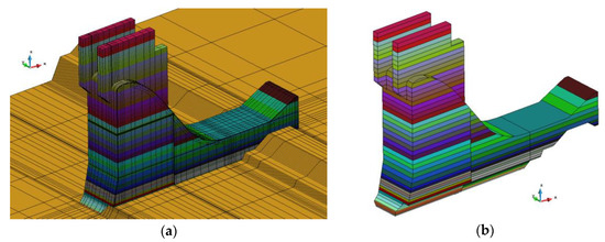 Three-dimensional finite element calculation model: (a) Overall calculation model; (b) Dam pouring layering.