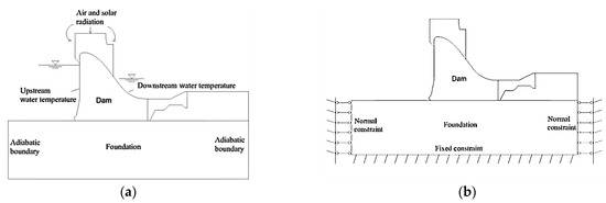 Calculation model boundary conditions: (a) Temperature boundary condition; (b) Stress boundary condition.
