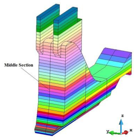 Since the gravity dam remains stable by its own weight, the entire dam is divided into several dam segments. All dam segments are individually stressed and are not affected by each other. Therefore, a single dam segment is established for numerical calculation. Simulation calculations adopt a three-dimensional finite element method. The model mainly included a dam, stilling pool, and foundation within a specific range under the structure. The three-dimensional finite element model is shown in Figure 1.