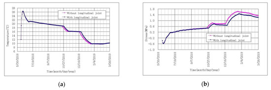 Temperature and stress process lines at the maximum stress point of concrete in the foundation constraint zone with and without longitudinal joint: (a) temperature; (b) stress.