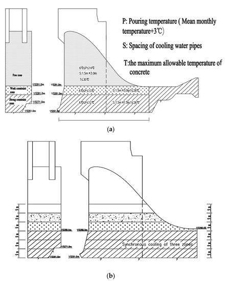 - If the synchronous cooling zone is 9 m in height (each grouted zone is 9 m in height), each grouting zone is cooled via cooling water. As the temperature difference and deformation between the upper and lower ground zones do not synchronize, the foundation concrete is under more vital constraints. The maximum stress in the middle of the strong constraint zone is up to 1.58 MPa, while cracks can be easily caused;