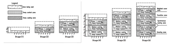 Phase 1 cooling in Figure 10 aims to reduce the concrete’s peak value and control the maximum temperature of concrete. The purpose of medium cooling is to control the temperature rise after phase 1 cooling of concrete and reduce the cooling range of concrete during Phase 2 cooling by slowly cooling in the medium cooling stage; the purpose of Phase 2 cooling is to reduce the grouting temperature.