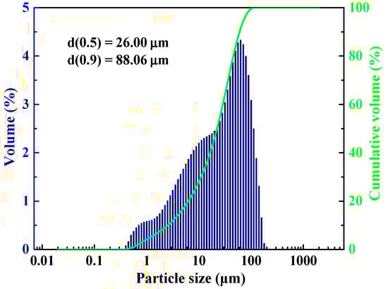The experimental powder was vacuum-collected from the surface of a backfill yard at a construction site in Hongqiao District, Tianjin, China; dried at 105 °C after debris removal; and then sieved through a 20-mesh filter cloth (850 μm). The silt content in the backfill powder was 3.5%, according to the AP-42 test method []. The calculated silt loading was 89 g/m2 based on the sampling area and the sampling mass. Silt accounted for most of the powder sieved through a 200-mesh filter cloth (75 μm), and its particle size distribution was measured with a laser particle size analyzer (Mastersizer 2000, Malvern Ltd., Leamington Spa, UK) at 25 °C. As shown in Figure 1, the median diameter was 26.00 μm. An X-ray fluorescence spectrometer (ARL QUANT, Thermo Fisher Scientific Ltd., Waltham, MA, USA) was used to determine the mass contents of SiO2, Al2O3, CaO, Fe2O3, MgO, K2O, Na2O, TiO2, SO3, and P2O5, and they were 59.93, 14.55, 10.22, 5.67, 3.93, 3.09, 1.05, 0.86, 0.26, and 0.12%, respectively, while other components accounted for 0.32%.