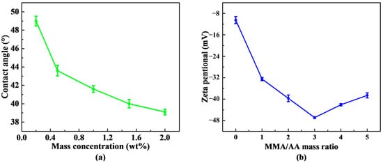 (a) Effect of AA mass concentration on contact angles, and (b) effect of the MMA/AA mass ratio on the Zeta potential of stabilized soil dust.