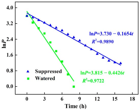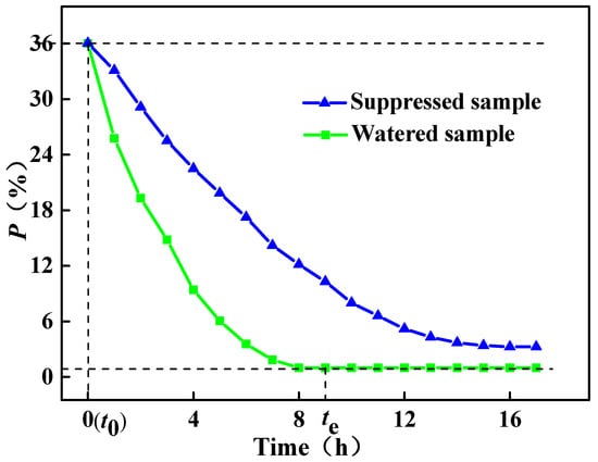 The drying times of the watered and suppressed samples in Figure 3 were 9 h and 17 h, respectively. According to Equation (5), the average moisture content of the watered samples was 6.38%, while that of the suppressed samples was 13.93%, which was 118.8% higher.