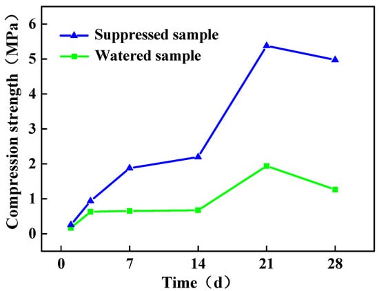The compressive strength on coal surfaces is no more than 30 kPa during railway transportation []. Accordingly, the compression strength on day 28 could be used as an evaluation parameter for dry dust suppression performance, and strength above 1.5 MPa was sufficient to suppress the generation of wind-blown dust in inland areas.