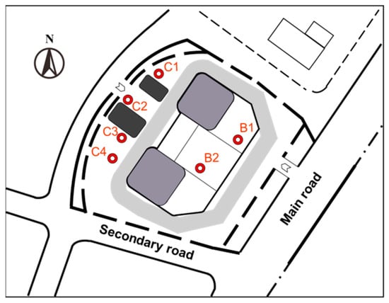 The layout of dust suppression areas at the construction site. C1 is the monitoring point. C2, C3 and C4 are monitoring points in the dust suppression area. B1 and B2 are the monitoring points in the control area.