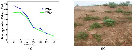 (a) Dust suppression efficiency at construction sites, and (b) surface state of the waste area on day 15 after dust suppression.