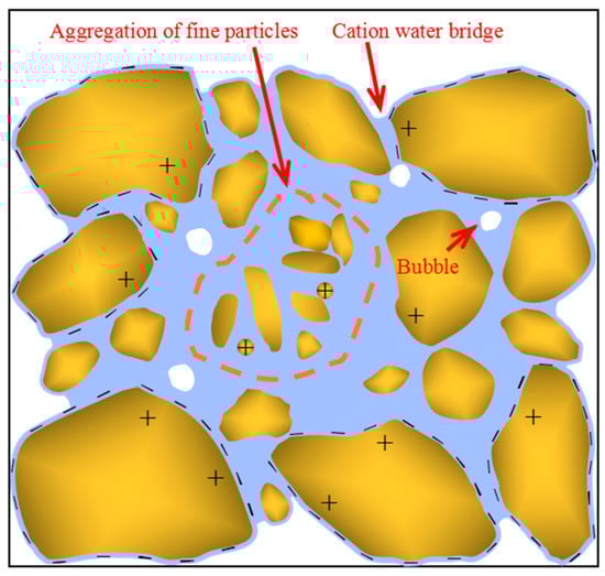 The soil for backfilling exhibited a three-phase structure consisting of mineral particles [], water, and air. At the saturated moisture content, all the pores were filled with water. During drying, moisture was first released from the soil pores ≥100 μm, enhancing cohesion and increasing the compression strength of the soil for backfilling (Figure 5). The bigger pores (>75 μm) lost moisture from day 3 to day 14 (Figure 8). At this time, the polymer promoted the aggregation of fine particles less than 10 μm and improved the compression strength []. From day 14 to day 21, water loss mainly occurred in the middle-sized pores (30–75 μm), and bigger particles in the watered samples began to aggregate spontaneously. In Figure 5, the strength of the watered samples on day 21 was 1.94 MPa, reaching 5.38 MPa when the agglutinated powder particles of the polymer and their surfaces were crusted. As the pores did not contain remaining water anymore, the effect became exhausted. The compression strength on day 28 for the watered samples dropped back to 1.26 MPa, while that of the suppressed samples remained at 4.97 MPa.