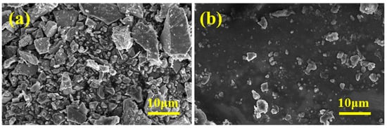 According to edaphology, soil is an aggregate of silt and clay []. Therefore, the waterborne polymer dust suppressant can prolong the water evaporation mainly by reinforcing the interaction between powder particles. The average particle size of the aggregate is reduced by anionic carboxyl radicals through the charge repulsion dispersion effect, while the powder cohesion is improved by hydrogen-bonding interactions between the aggregate and the Si-O and Al-O bonds on the powder surface []. Figure 9a, b shows the surface morphologies of watered and suppressed samples, respectively. The particles in Figure 9a were more evident and bigger, exhibiting high porosity, rapid volatilization, and low strength compared to the particles in Figure 9b, which were smaller and exhibited dense surfaces due to the dispersion effect and intensified cohesion, respectively. They possessed consolidation layers similar to clingfilm to inhibit water evaporation and enhance the moisture content and compression strength.
