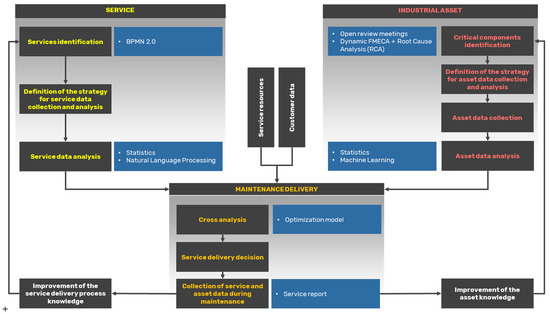 From this literature background, it emerges that there is a necessity for guidance in terms of data collection and usage processes, as well as the availability of decision-making tools for the companies dealing with maintenance-based services and exploiting the Industry 4.0 technologies [8,19,38,42]. Other authors proposed data-driven approaches and case studies for maintenance delivery (e.g., [24,43,44,45]), focusing on specific instruments aimed at supporting problem identification or resolution, but none adopt the comprehensive perspective proposed in [10] at a theoretical level. In [24,43,44], the use of FMECA is suggested to handle the definition of the criticality of the asset, and [43] uses BPMN2.0 to describe the maintenance-related process. What emerges is that [10] provides a more general perspective on the process, devoting attention to both the maintenance service and the asset monitoring (as will be better explained in the next section), providing suggested methods to handle each phase of the process.