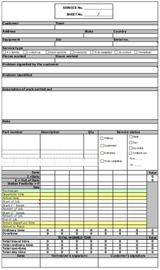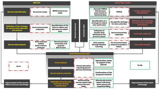 Different issues characterized the original maintenance service delivery processes. For instance, an unstructured trial-and-error activity based on the technician’s experience was carried out at the beginning of the maintenance intervention to identify the assets’ problems, or the customers frequently required discounts on the billing price proposed by Beta at the end of the intervention, increasing the time and the effort needed to finalize the transition. Furthermore, even if Beta was used to fill service reports after each maintenance intervention, it realized that most of these data were unstructured and some important information was missing (e.g., components worked, spare parts used).