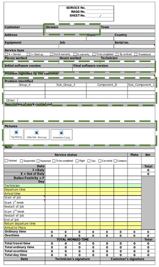 As mentioned above, Beta was already collecting data while providing maintenance. Despite this, the data were usually unstructured (i.e., free text), incomplete (i.e., reports were seldomly fully completed), challenging to interpret and, thus, time-consuming to analyze. For Beta, this was one of the main limitations preventing it from improving its maintenance performance. Therefore, Beta decided to update the content of the service report to cope with the gaps identified and allow a more valuable data analysis. As part of the reengineering strategy, Beta decided to upgrade the original service report with new features to guide the filling phase instead of introducing a completely new instrument. This decision followed the intention of not revolutionizing the workflow of the technicians used to deal with Excel-based reports. Beta decided to simplify its filling (e.g., introducing drop-down menus, showing warnings in case of empty fields) so that the technicians would have been able to handle the changes immediately, without the need for specific training sessions. Among the changes, one can highlight the presence of:
