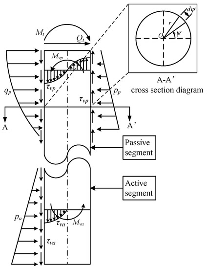 In the current paper, the distribution of vertical soil friction and the resistance moment for pile shaft are graphically illustrated in Figure 2, in which the vertical soil friction is simplified and evaluated as linear elastic distribution. By integrating the area of the cross-section A-A’, the vertical friction resistance moment for the pile shaft in passive and active segments are