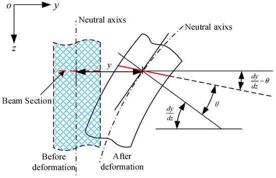 In view of the influence of shear deformation on the whole deformation for the pile shaft, in the current paper, Timoshenko beam theory [49] is adopted to establish associated differential equations for later analysis for simplicity, as illustrated graphically in Figure 3. In detail, in this theory, the plane section hypothesis is used, viz., the cross-section of the pile shaft remains as a plane after bending, whereas the cross-section is no longer perpendicular to the original neutral axis.