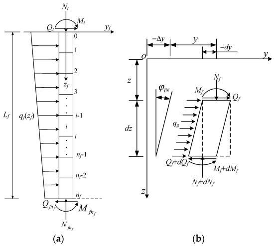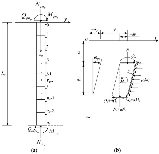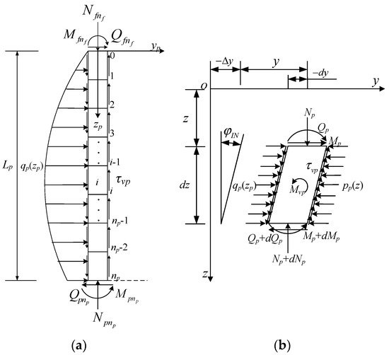 Similarly, for the pile in the passive segment of the pile shaft, an independent local coordinate system on the ith discrete segment with subscript p (Figure 5a) is established and, discretizing it into parts with length , the average axial force of each discrete segment can be evaluated by