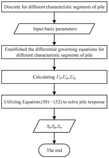Substituting one of the pile-top boundary conditions and one of the pile-bottom boundary conditions into Equation (15), the rest of the variables of the pile top could be obtained. Thus, based on the response of the pile top , the solution of the pile in the free segment at any depth is expressed as