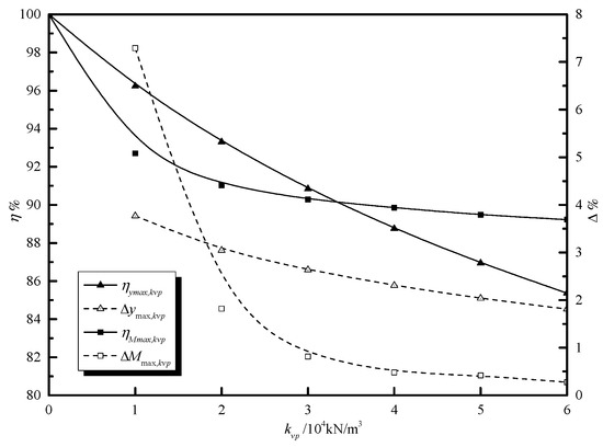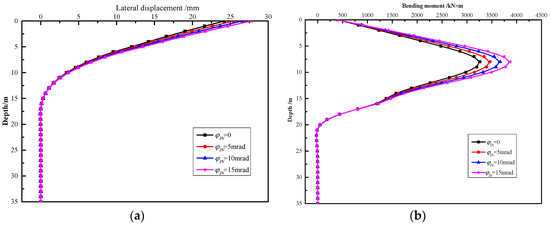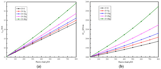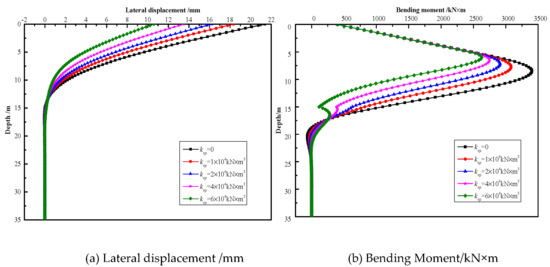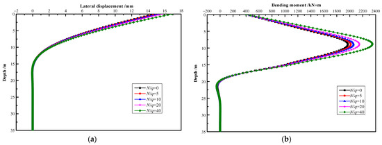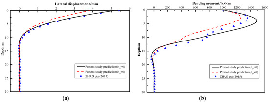 Specifically, in this case, the pile shaft is located in the rock slope, the corresponding rock layers for the passive and active segments are the strongly weathered rock and slightly weathered rock, with the thickness of 10 m and 20 m, respectively. Therefore, according to the national code [48], the horizontal resistance proportional coefficients for those two types of rock layers are determined as mp = 5 MN/m4 and ma = 50 MN/m4, respectively. In this case, the influence of the vertical friction in the passive segment of the pile shaft was taken into account. By assuming that the other parameters are constant and ignoring the slope effects on the vertical resistances in the passive segment of the pile shaft, the vertical subgrade coefficients of the foundation can be determined as kvp = 3 × 105 kN/m3 [48]. Hence, the comparison results are obtained as illustrated in Figure 9. In detail, in Figure 9, it can be observed that the predictions generated by the proposed method are extremely closed to that of ZHAO et al.’s [41] work for both the lateral deformation (Figure 9a) and the bending moment (Figure 9b). The errors between predicted results and ZHAO et al.’s [41] work of maximum lateral displacement and maximum ending moment of pile shaft is about 4.99% and 7.52%, respectively. It is also understood from Figure 9 that there are marked reduction effects on the lateral response of the pile shaft due to the vertical friction in the passive segment. It is illustrated that the horizontal deformation for the pile-top is reduced by 25.36% and the maximum bending moment for the pile shaft is reduced by 19.40% by dint of the effects caused by the vertical friction, respectively.