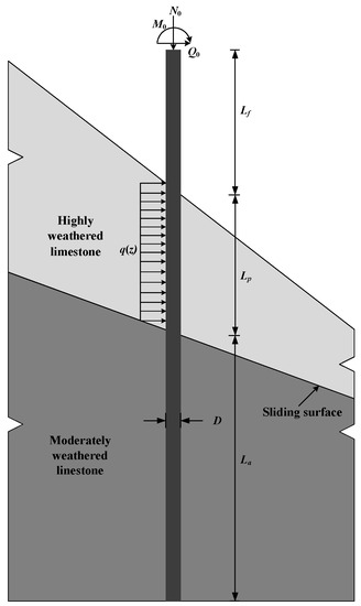In engineering practice, it is noteworthy that the diameter D for most piles in usage is greater than 0.8 m, a number of studies [43,44,45,46,47,48] indicated that, for such piles, the moment of resistance induced by vertical friction could affect the behaviors of both the lateral deformation and internal force of a pile shaft, and this effect will be enhanced with an increasing in diameter D or the rigidity of the surrounding soils. Mcvay et al. [45] conducted a centrifugal model test and developed relevant theoretical and numerical calculation models for estimating the moment of resistance for the vertical friction of the pile shaft. Zhu et al. [47] proposed a simplified theoretical calculation model for evaluating the above-mentioned moment of resistance by adopting friction enhancement theory and several vertical friction models, and further conducted lateral horizontal deformation analysis for pile shafts based on the transfer-matrix method. However, up to now, the previous studies were mainly focusing on the analysis of the lateral response for pile shafts under horizontal load; the studies on the lateral deformation of the pile shaft in a slope by considering coupling effects, including the vertical friction, are extremely limited.