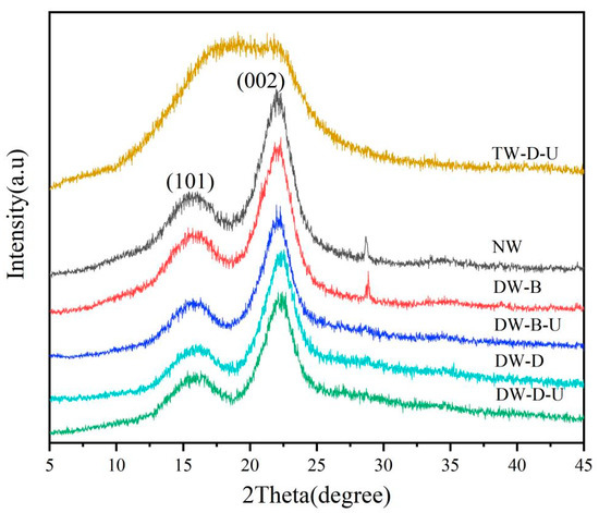 Cellulose is a macromolecular compound with homogeneous polycrystalline, which consists of a large number of microcrystalline of about 10 nm in an entirely irregular molecular chain [29]. The percentage of cellulose crystal region in the entire cellulose is called the crystallinity of cellulose. It can be seen from Figure 3 that in the XRD diagram of natural wood, the highest peak is located at 2θ = 22.3°. This peak is the 002 crystal plane, which is higher than the peak value of the 101 crystal plane, mainly because the molecules in the cellulose are on the plane of the 002 crystal. The structure of cellulose in wood is complicated. Compared to the natural sample, the 002 crystalline surface peak of DW-D-U is reduced, and the half-height width of the diffraction peak becomes wider. The size of the microcrystals was calculated using the Scherrer equation based on the half-width of the diffraction peak. There is a slight reduction in the grain size of the treated delignified samples compared to the grain size of the original samples. A minor disruption of the structure of the cellulose macromolecules of delignified wood occurred [30,31]. The diffraction images of “transparent wood” indicate that the area where the crystal peak is located is between 17° and 22°, and there is a significant difference between natural wood, indicating that the penetration of epoxy resin changes the internal crystal structure of the wood.