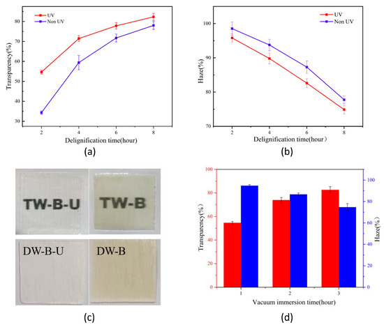 In addition, the impregnation time of the “transparent wood” in the TW-D-U group was changed to 1 h and 2 h to obtain the TW-D-U1 and TW-D-U2 groups, respectively. The transmittance and haze were measured to be 55% and 95% for the TW-D-U1 group and 74% and 87% for TW-D-U2. As shown in Figure 4d, the transparency increases with the time of impregnation, and the haze gradually decreases, resulting in a clearer picture through the transparent wood sheet and better optical properties. As the impregnation time increases, the more epoxy resin immerses into the cell and binds closely to the cell wall, the fewer pores become. The degree of refractive index matching inside the transparent material increases; thus, light produces less refraction inside, leading to a decrease in haze and an increase in transmittance [11].
