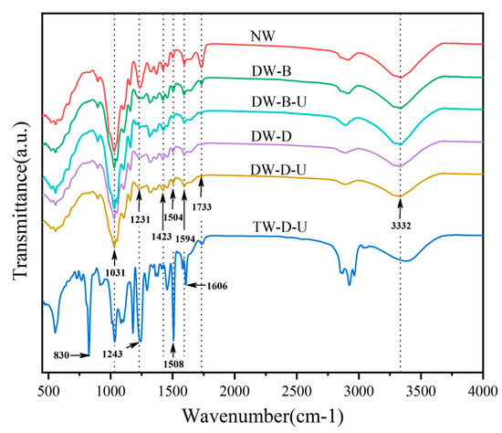 The infrared spectroscopic images of balsa wood treated under different conditions are shown in Figure 5. Lignin has a variety of complex structures, and the quinone structure of lignin is the main factor that gives lignin its colour [32]. As seen in Figure 5, compared with natural wood, infrared absorption 1733 cm−1 peak of C=O in the quinone structure of lignin in the four groups of delignified wood essentially disappeared, indicating degradation of chromophoric groups [33]. This is due to a reaction between hydrogen peroxide and the quinone structure of lignin, destroying its structure and changing into other colourless structures. The chromophore groups of lignin are removed to whiten the wood [34]. In addition, by comparing the infrared spectra of DW-B-U and DW-B, we found that the spectral lines of the two groups overlap. Still, the peak value of DW-B-U at 1733 cm−1 is lower than that of DW-B group, which can indicate that UV irradiation accelerates the removal of chromophore groups in wood to a certain extent. This is also confirmed by the fact that the transmittance of TW-B-U is better than that of TW-B group in the transmittance and haze test mentioned above. In addition, the absorption peak of the aromatic ring skeleton group of lignin decreased slightly at 1504 cm−1, the reduced absorption peak at 1231 cm−1 of lignin acetyl and ether, and reduced intensity of the peaks at 1031, 1231, 1423 and 1594 cm−1. This means that while the chromophore group is removed, a small part of the lignin in the wood is dissolved in the alkaline solution. Compared with the spectra of original wood, the intensity of the infrared spectra of DW-D-U and DW-D samples decreased significantly at 3 332 cm−1, indicating that the cellulose structure of lignin delignified wood was damaged to a certain extent [15].