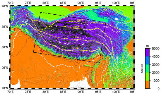 Tectonic map of the Himalayan orogen, including the major topographic features and sutures: YTSZ, Yarlung–Tsangpo suture zone; BNSZ, Bangong–Nujiang suture zone; JRSZ, Jinsha River suture zone; EKSZ, East Kunlun suture zone; ATSZ, Altyn Tagh suture zone; KF, Karakorum fault; MBT, main boundary thrust. Dashed lines indicate the main orogenic region focused by this study.