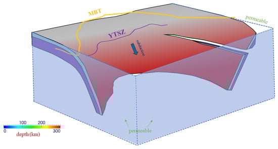 In this model, subducted plate geometry is kinematically prescribed according to Slab2.0 on the basis of seismic tomographic data [14] for depths of <60 km. The slab topography with a depth of 60–100 km adopts the extrapolation method and is assumed to feature steep subduction (45°) before 42 Ma (Figure 2) and shallow subduction (15°) after 42 Ma. The model dimensions are 72 × 72 × 72 grids. The Indian lithosphere is estimated to be >40 km thick according to Yoshii [15]. The temperature boundary condition agrees with the plate cooling model [16]. The slab’s bottom and perpendicular planes are prescribed as adiabatic and permeable, while the top surface is set to be a constant temperature (0 °C) and permeable, allowing crustal extrusion and uplift. The composite upper mantle viscosity under a given condition is