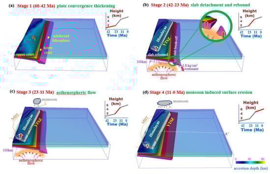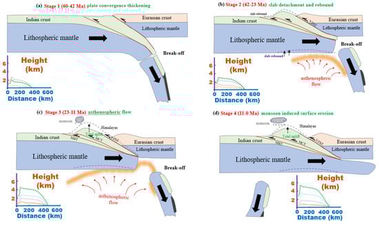 The four stages of the Himalayan uplift based on 3-D subduction modeling. Red arrows denote the elevation of the Himalayas. MBT, main boundary thrust; YTSZ, Yarlung–Tsangpo suture zone. The insets are modified from Ding et al. [4]. (a) Plate-convergence-induced thickening (60−42 Ma). (b) Progressive uplift of the Himalayas caused by slab detachment and rebound (42−23 Ma). (c) Upward asthenospheric flow causing rapid uplift of the Himalayas (23−11 Ma). (d) Slowed uplift of the Himalayas affected by surface erosion (11−0 Ma).