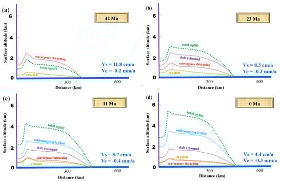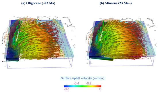 Considering the influence of crustal deformation, developed folds, and arc magmatism, the regions adjacent to the Yarlung–Zangpo suture zone are conjectured to have undergone rapid crustal thickening accompanied by structural shortening after the initial collision, which is evidenced by the formation of adakitic rocks (e.g., [22,23]). The Himalayan orogen is inferred to have featured a north-south compressional setting according to magmatic rock exhumation. The effect of crustal thickening was predominant in determining the uplift rate in the Paleocene and Eocene during the early evolution of the Himalayas (Figure 5a and Figure 6a). The velocity field of the Himalaya orogen slows from south (>0.3 mm/year) to north (<0.1 mm/year), indicating strong shortening between India and Eurasia (Figure 4). In the second stage, the Himalayan uplift was linked to the detachment of the subducted Indian Plate. The mean compressive stress increased within the Indian plate and decreased the slab pull (e.g., [24]). Associated rebound occurred, facilitating uplift and increasing the elevation of the Himalayas by approximately 1.5 km prior to 23 Ma (Figure 5b and Figure 6b). After slab break-off, the upwelling asthenospheric mantle flow also affected the acceleration of the uplift rate after 23 Ma in stage 3 (Figure 5c and Figure 6c). Guo and Wilson [25], using Sr-Nd-Pb isotope data, indicated a change in the distribution of magmatism in Tibet, implying that asthenospheric mantle flow triggered further melting. Subducted Indian slab rollback could also have resulted in east-west-trending slab break-off ([26], shown in Figure 2). A large number of small tears within the underthrusting Indian plate are due to the upwelling of asthenospheric flow [27].