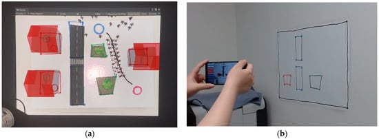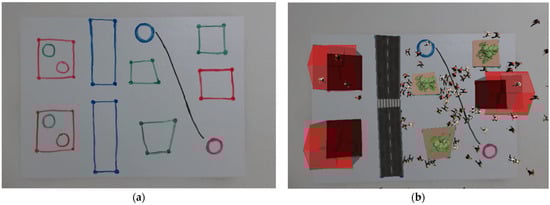 Extensive research is being conducted to implement AR that makes virtual 3D models appear in real life. In general, AR uses cameras and recognizes specific markers to position virtual objects. When the camera detects the markers, it places the desired 3D model in the same location. An advantage of marker-based AR is that it allows users to view a virtual 3D model from multiple perspectives. In urban environment planning, for instance, ArUco markers have been applied to place various building 3D models in specific locations []. In addition, a marker similar to a floor plan was developed for users unfamiliar with complicated floor plans []. These systems were used to enable users to understand the building constructed using the floor plan. These AR systems can increase the immersive feeling for users. To make an even more life-like virtual space, researchers have begun to integrate the scenes with large crowds into the augmented reality space. Worst et al. used cube markers as obstacles to create a virtual crowd in a museum []. In this study, visitors were able to place cube markers as architectural structures which acted as obstacles and affected crowd movement automatically. This allows visitors to become more immersed in constructing an urban environment through the interaction between the visitor and virtual environment. Subsequently, a beam projector was used to make the crowd visible to a large number of people. However, because it can only construct specific types of obstacles, the simulation is limited in that it cannot produce a variety of architectural structures.