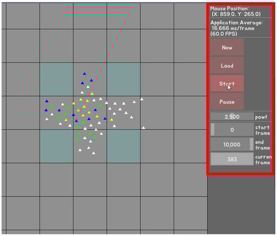 Graphic user interface (GUI) of crowd simulation in computer: All parameters for the simulation are set with widgets, such as sliders or buttons.