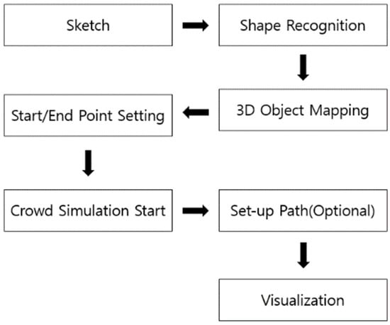 The remainder of this paper is organized as follows. In Section 2, we introduce prior research approaches for applying AR and previous studies on augmented reality, including crowd simulation. In Section 3, we present detailed algorithms for shape recognition, environmental authoring tools, routing, and crowd generation. In Section 4, we perform a series of experiments for generating environments with the authoring tools we propose, and we conduct a comparative survey between the sketch-based AR environmental authoring tool and the computer-based environmental authoring tool. Section 5 examines the proposed method and discusses the future research directions.