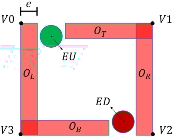 Buildings with exits are created differently. They are installed using four rectangular walls on four sides as shown in Figure 5, and the method for installing the wall uses the following set of points from (1)–(4). The 2D points in the curly brackets represent the four corner vertices of the wall. In this set, , , , and are the four surrounding walls, where is the left wall of the building, is the right wall, is the upside wall, and is the bottom wall. is the center point of the green circle, representing the entrance, whereas ED is the center point of the red circle, which is the exit. is the thickness of the building wall.