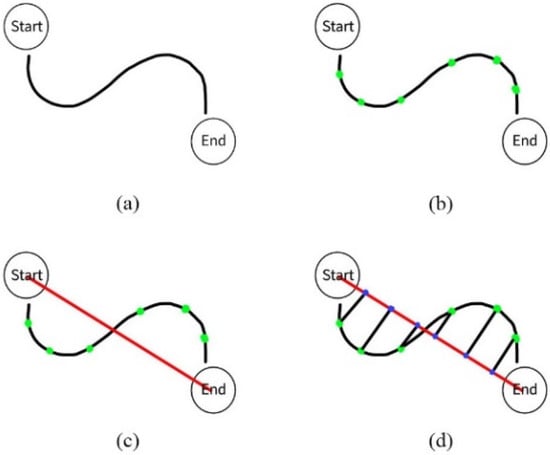 However, when we create point set as shown in Figure 6b, it is not sorted in the order along the path. Therefore, all points in the set must be sorted from the starting point to ending point. Figure 6c,d show a projection that aligns point set onto the vector from the starting to end points to obtain a new point set . Sorting is performed as follows. After the projection of the point set in is performed, the distance , representing the distance from the starting point to point in , is calculated using Equation (6) as follows: