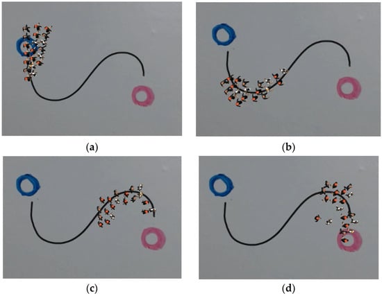 Crowds moving along the path from the starting and ending point. Note that there is no inter-penetration between characters during the animation. The figures from (a–d) are crowd simulation results over time where (a) is starting and (d) is the ending scene.