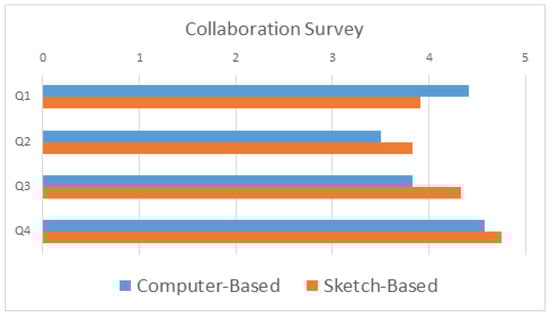 The accessibility of the sketch-based environmental authoring tool can be confirmed by Q2 in Figure 15. Accessibility is used to check how easy it is to access the service without any inconvenience. With higher accessibility, the users will be more comfortable using it without restrictions. In Q2, users answered that if the 2D screen-based environmental creation authoring tool were to be used again, then technical assistance would be required. In the case of pairs that were unfamiliar with computers, when they use the basic 2D screen-based authoring tools, they answered that they still required some assistance from experts and repeated explanations would still be required the next time they used the tool. The need for a technician’s assistance is a limiting factor when using the tool. From this, we can conclude that the sketch-based authoring tool has better accessibility than the 2D screen-based tool.