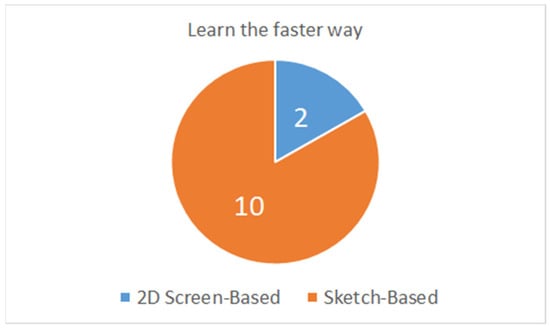 Figure 14 shows the results of a survey on learnability between the 2D screen and sketch-based environment creation methods. Learnability is a sub-characteristic of usability, representing how easy it is to learn to use the tools. Ten participants answered that the sketch-based environment was faster than the 2D screen-based environment. Thus, it was concluded that the sketch-based environment creation method was more efficient in terms of learnability.